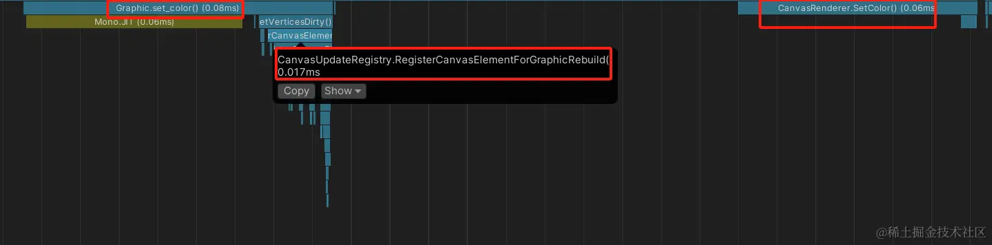 从Profiler耗时比较来看,两种方法差距不明显,若去掉MonoJIT的编译耗时,可能Image.color效率还更高一些。