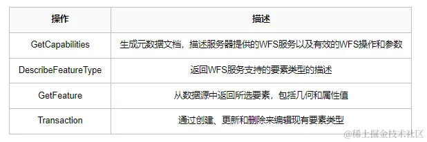 除了以上四种常用的操作,WFS还有一些其他操作,有的操作还是特定版本特有的,篇幅所限笔者这里就不介绍了。另外,相信读者也能感受到,WFS提供的一些操作确实非常复杂繁琐。对于空间数据的增删改查,直接使用地理数据库+定制的后端接口也许更为方便安全一些。