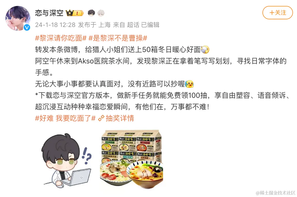 对此,恋与深空立马联动白象、反手一个吃面热搜转发抽奖,算是以一种搞笑玩梗的方式化解了此次公关危机。不得不说,叠纸这种滑跪就滑跪的官方态度还是值得绝大多数游戏公司深刻学习的。