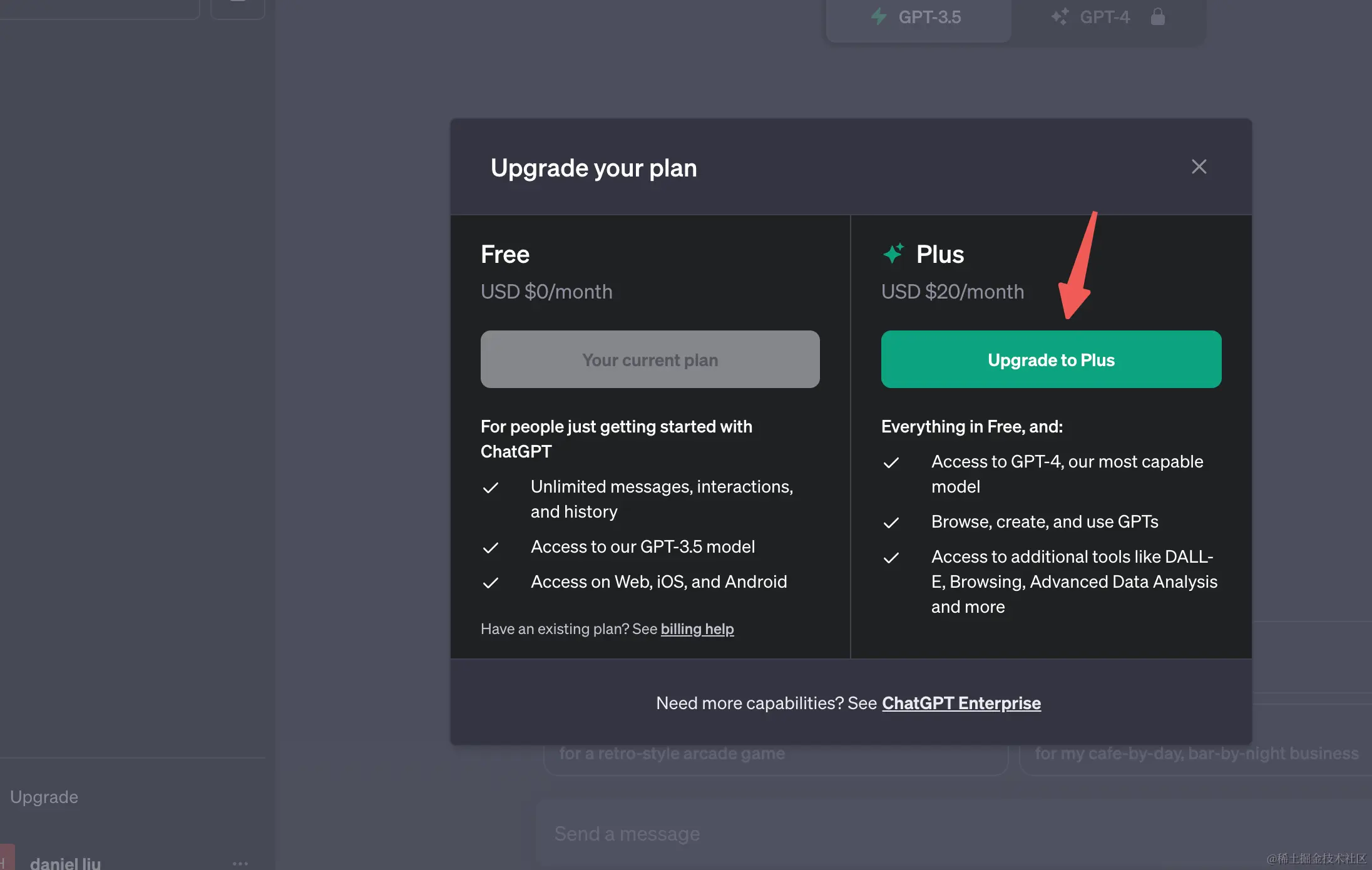 登录自己的 OpenAI 帐户后,点击左下角的 Upgrade to Plus,在弹窗中选择 Upgrade plan。