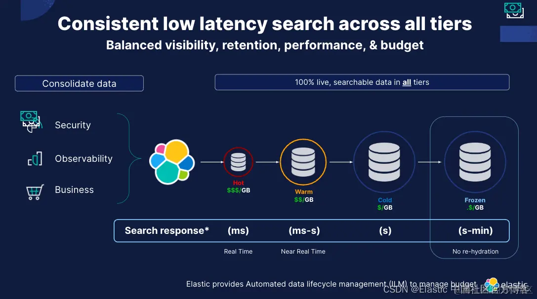 - 无论数据大小或层如何,都可以通过一致的低延迟搜索进行快速搜索:Elastic 提供跨热/温/冷/冻结的 TB 数据搜索能力,查询结果在 10 秒 (ms) 范围内。