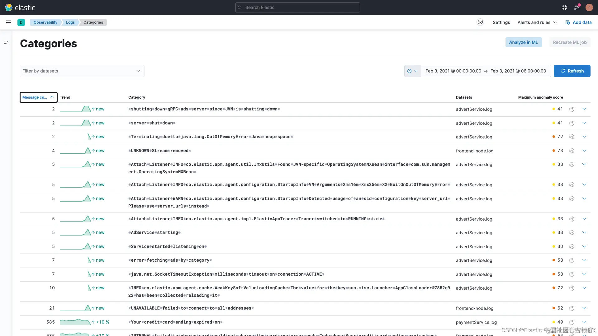 你无需成为数据科学家即可创建和运行 ML 作业或查询。 因此,你将能够更好地在问题发生之前发现它们。 此外,日志分类和 APM 关联等开箱即用功能可快速帮助根本原因分析,减少代价高昂的停机。