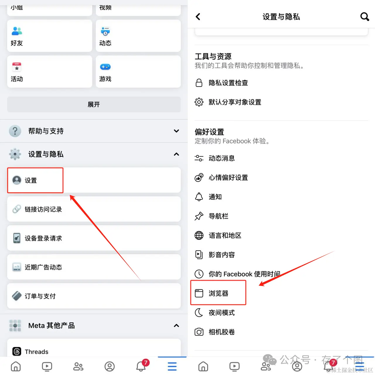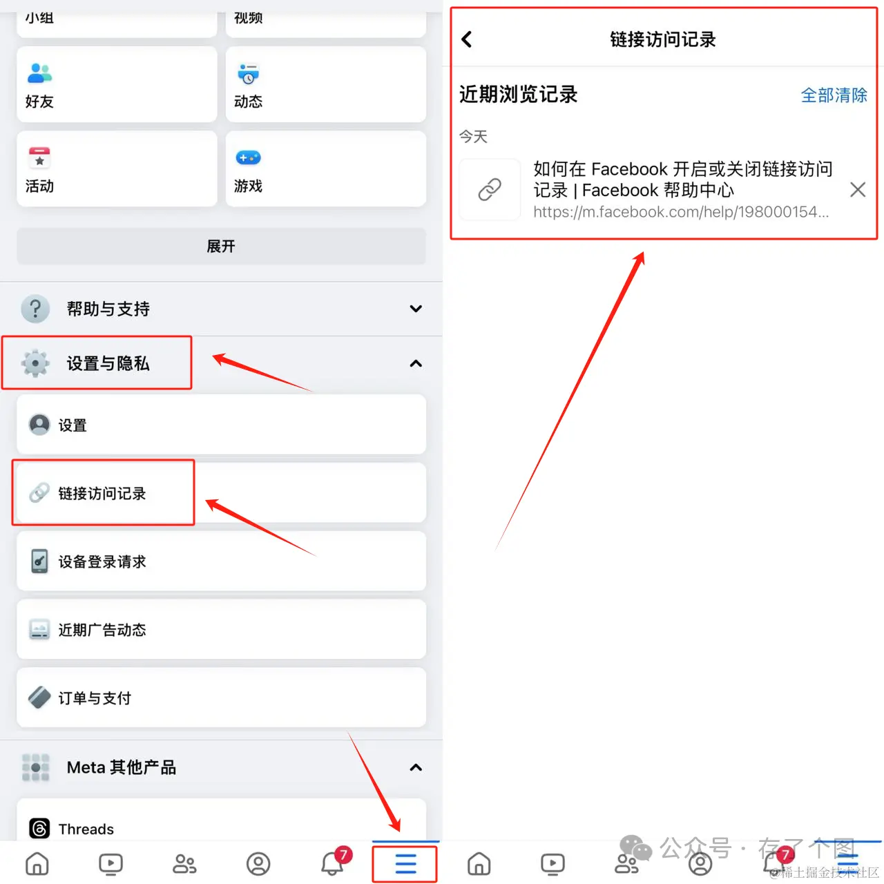 点击脸书右下角“三横杠”进入找到“设置与隐私”,点击下方的“链接访问记录”,即可查看近期30天的浏览记录~(可以单击“×”删除单挑链接记录,也可以点击“全部清除”删除所有链接记录)