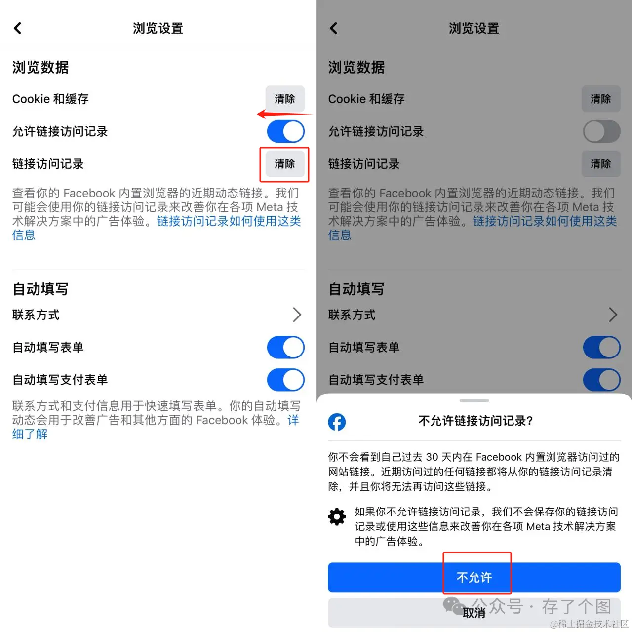 按照箭头反向关闭“允许链接访问记录”后点击“不允许”即可,反之则是开启链接记录功能!同样的点击下方“清除”也能一键清除所有脸书链接记录哦~
