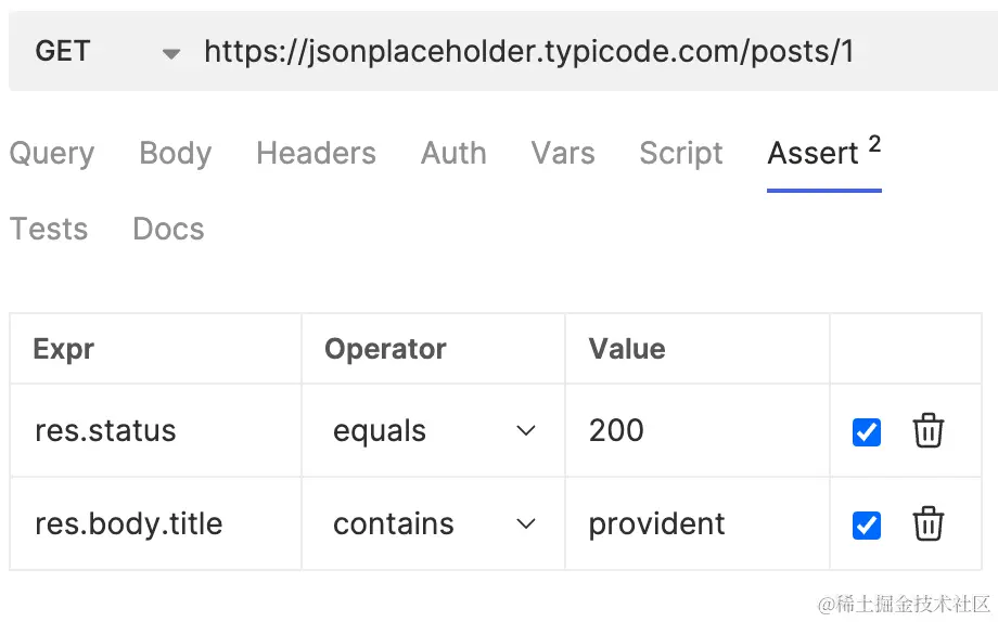 输入断言 1:响应状态码等于 200.断言 2:响应体中的 title 包含 provident