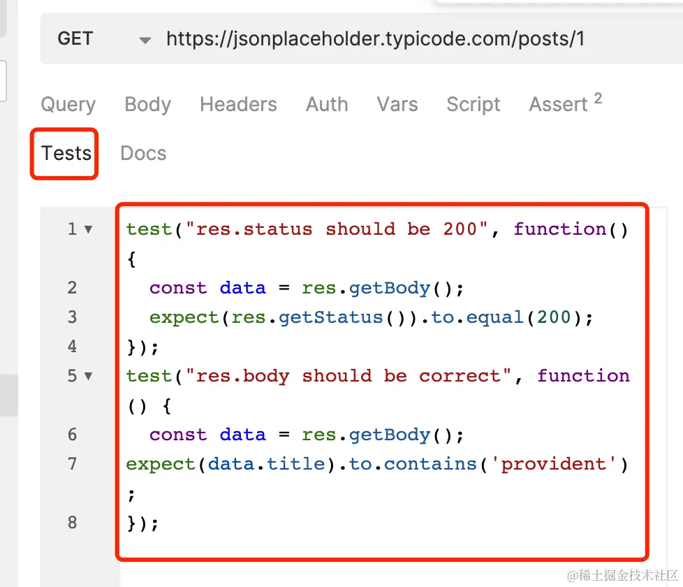 - 输入脚本代码,断言 1:响应状态码等于 200.断言 2:响应体中的 title 包含 provident