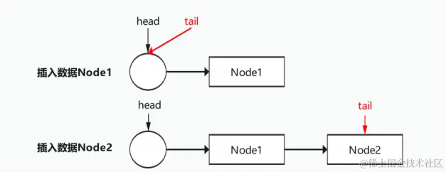 当tail指向的节点的下一个节点为null的时候,也就是说当前队列状态就可以直接插入新的数据,因此直接插入节点即可不更新tail。当tail指向的节点的下一个节点不为null的时候,就需要找到队列“真正”的队尾节点,就需要执行队列寻址队尾节点的操作,直至找到队尾节点后插入新的数据节点并通过casTail进行tail更新;