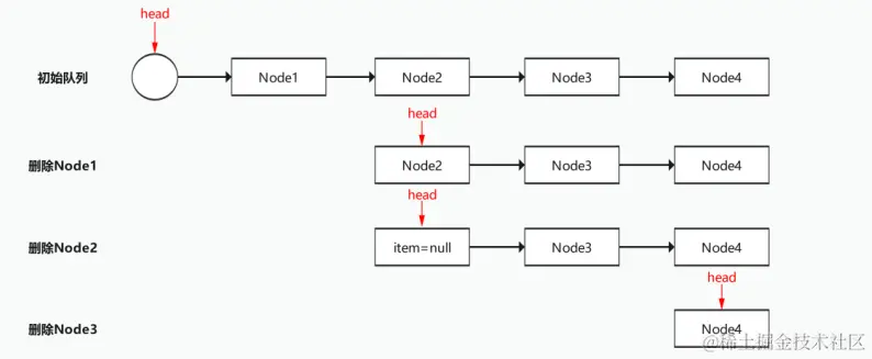 - 在删除元素时,通过CAS操作修改链表的头节点引用,将头节点移除。同样,只有一个线程能够成功修改头节点,其他线程会重试直到成功。