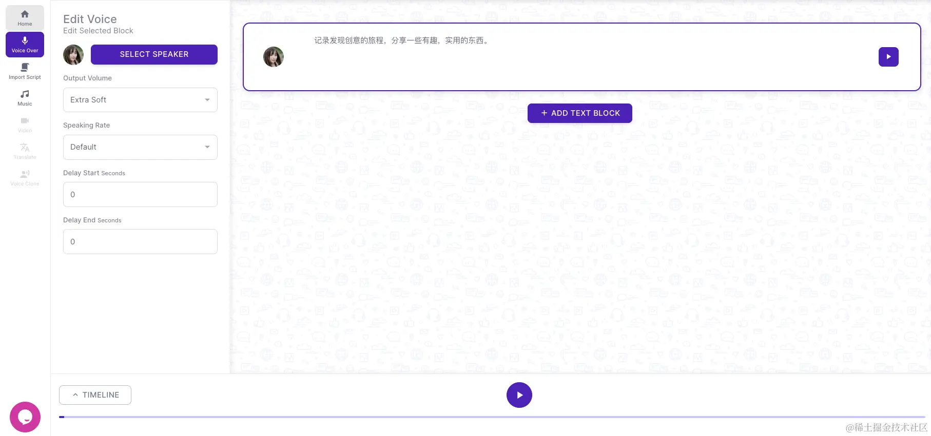 Gotalk 是一个 AI 语音配音工作室,平台提供50种不同语言的400种 AI 语音和8000种音轨。它具备克隆真实声音的能力,并与 Open AI 进行集成,可以进行网络爬取,为企业或个人提供定制录音。可以手动输入文案或者文案导入,可以调整语音的语调与语速,使得声音更加接近真人,生成的声音效果还是不错的,只是需要升级会员才能导出音频与解除时长限制。