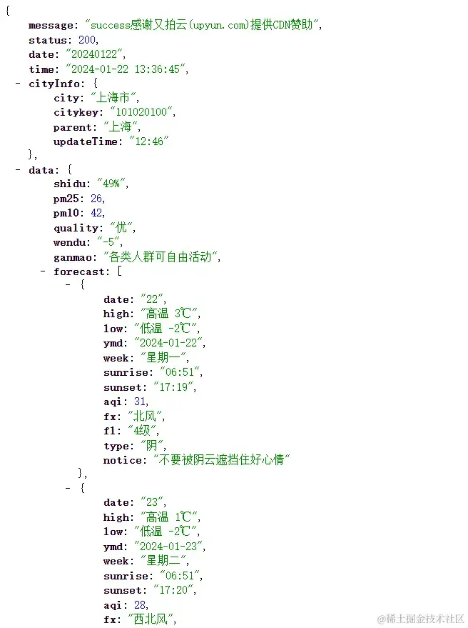 因为返回的结果有近15天的天气,所以要对结果做一个遍历,取出今天对应的天气信息。同时天气更新时间为每天的:3点,8点,13点,19点,所以建议不要凌晨去获取,加上CDN有1个小时的缓存,建议4点,9点,14点,20点后获取。