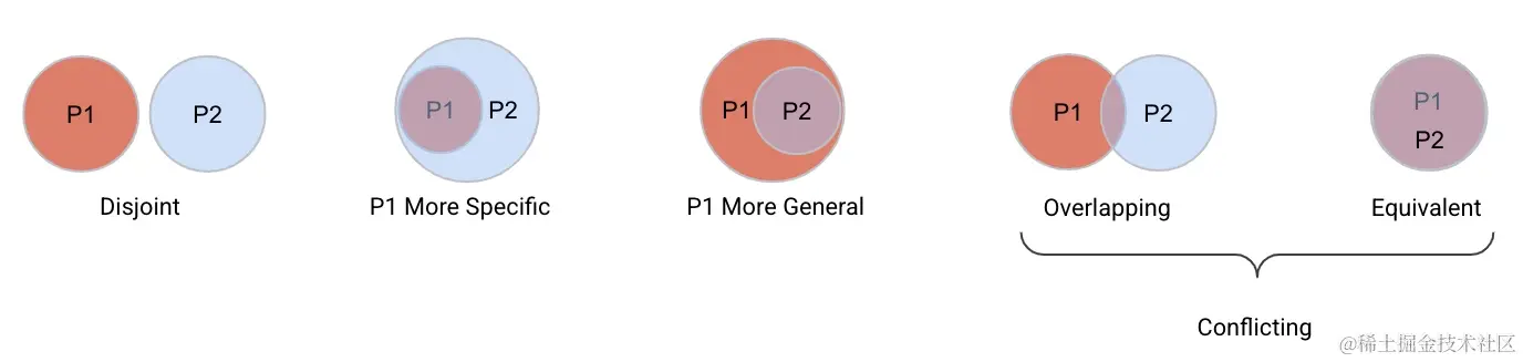 - 如果 P1 符合 P2 请求的一个(严格)子集,也就是说:如果 P2 符合 P1 的所有请求及更多请求,那么 P1 就比 P2 更具体。