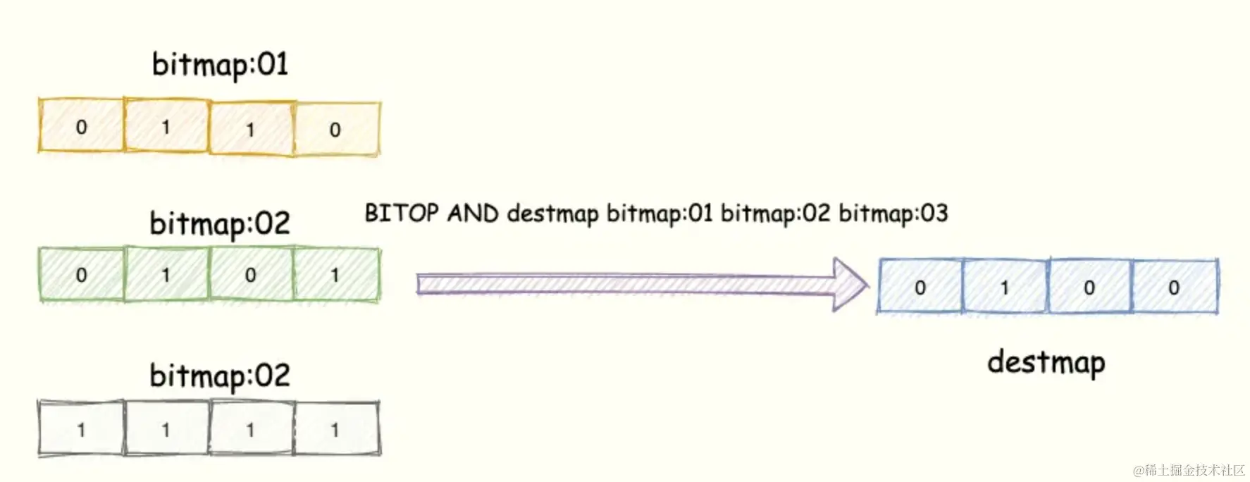 BITOP AND destmap bitmap:01 bitmap:02 bitmap:03