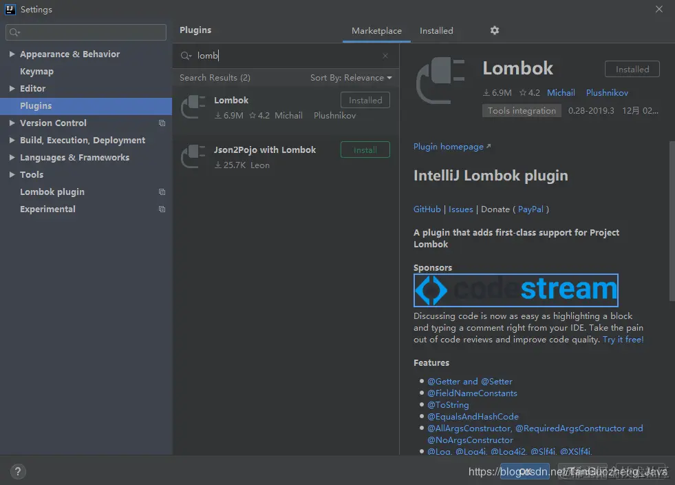 依次在IDEA中点击 File——》Settings——》Plugins,输入Lombok,选择Lombok的Installed进行安装