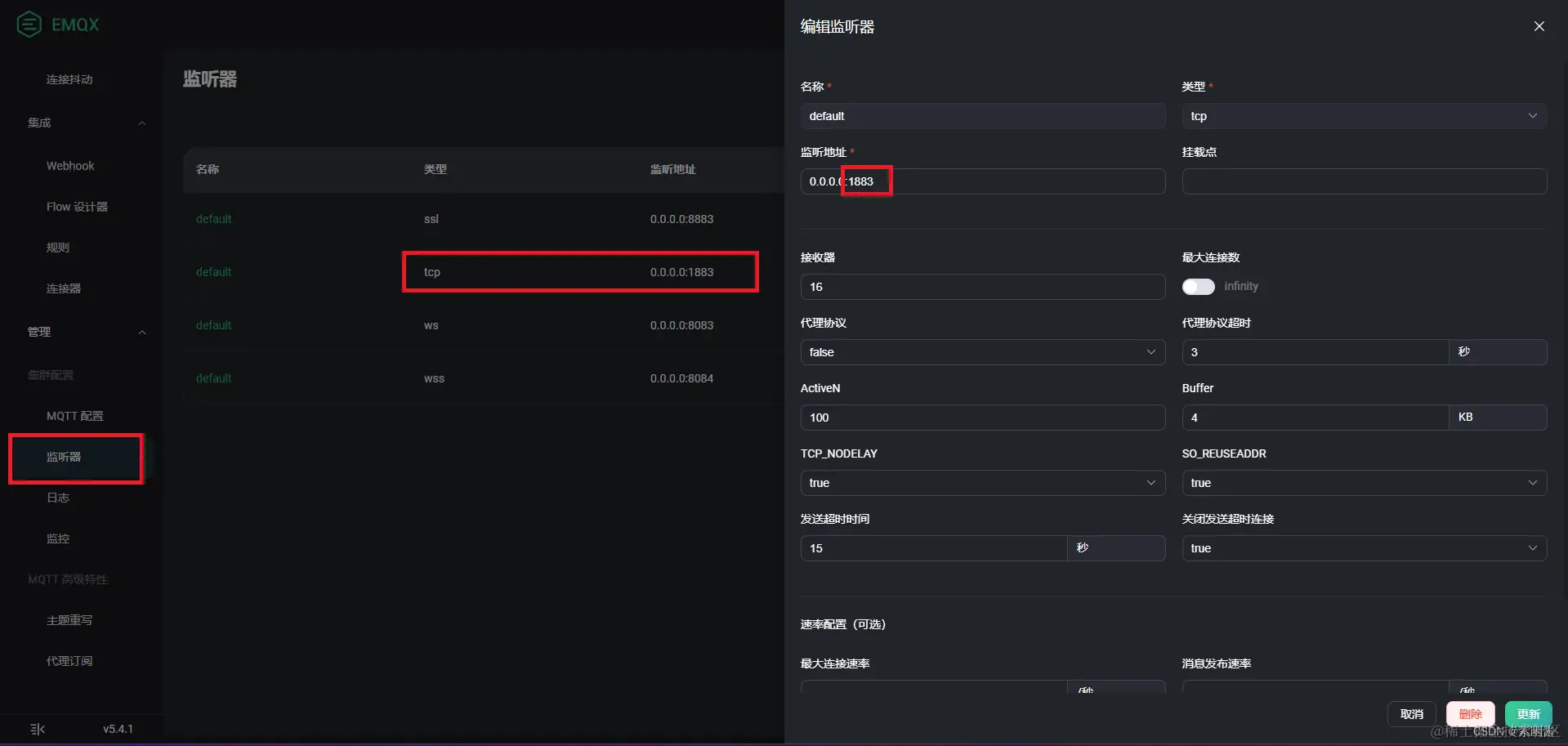 emqx有几个默认端口需要开放,tcp:1883,ws:8083,wss:8084,ssl:8883,这几个是可以修改的,也是可以在dashboard里设置