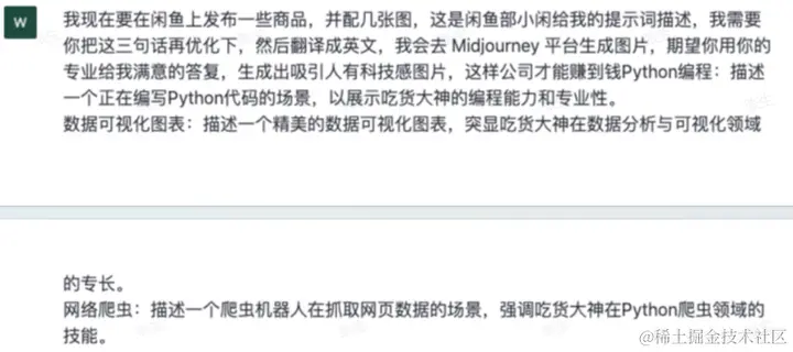 最近天天在朋友群内看到朋友接单(出售提示词,图片),轻轻松松半小时就赚200-300,特意探索了一下相关玩法,总结出一套ChatGPT+Midjourney+闲鱼赚钱方法,主打的是易上手,有可操作性!