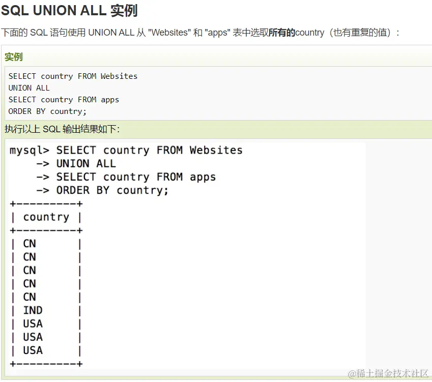 - Union All:不去除重复行,返回包含所有行的结果集,包括重复的行。