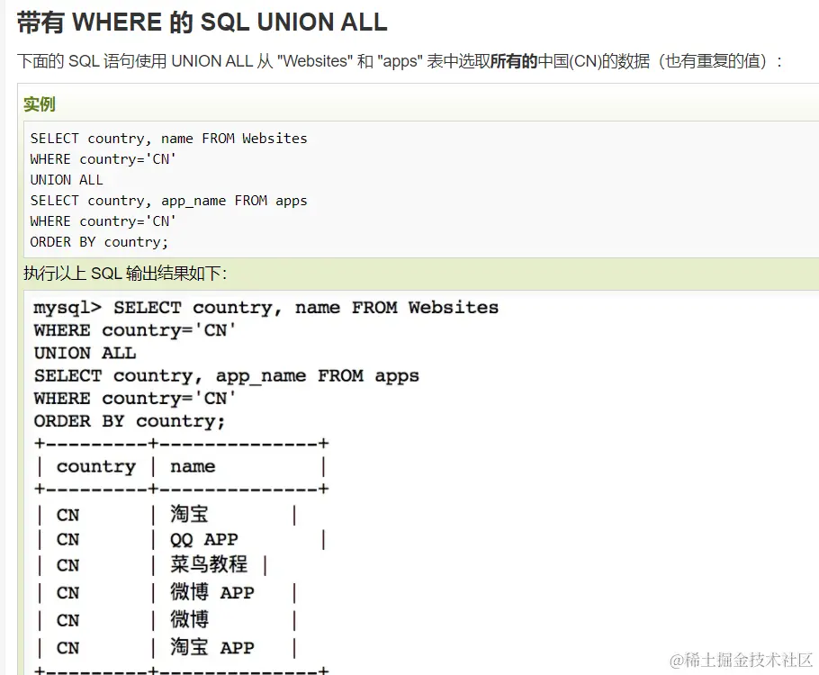 在实际应用中,应根据需求选择合适的操作符。如果不需要保留重复的行,可以使用 UNION ALL 以获得更好的性能。如果需要保留重复的行,或者不确定是否存在重复数据,则应使用 UNION。