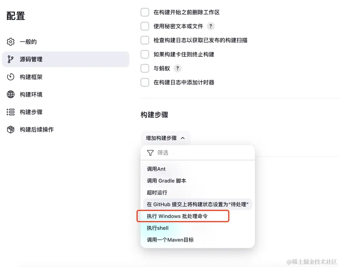 然后在构建栏目下拉菜单选择:Excute Windows batch command