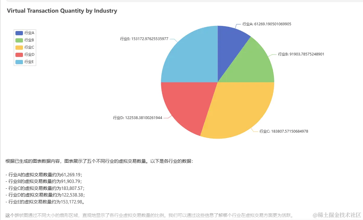 我们能够迅速比较各个行业在虚拟交易市场的活跃水平和市场份额。行业C在图表中占据最大的扇形面积,明确显示了其在交易市场中拥有显著的主导地位,这表明行业C的交易数量远超其他行业。图表为我们提供了清晰的市场概览,帮助我们更好地理解各行业在交易领域的相对地位。
