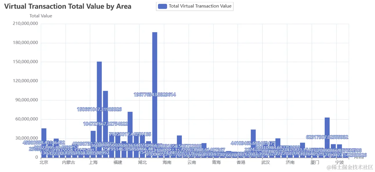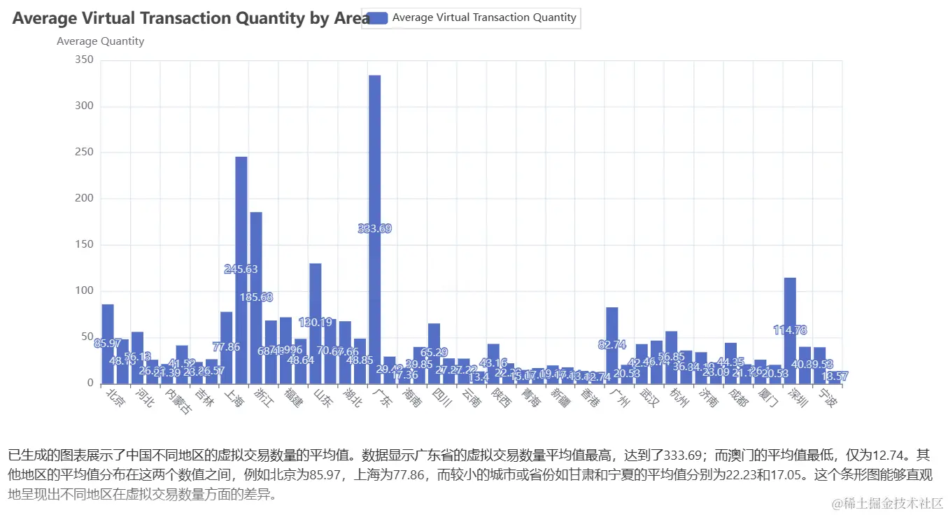 图表展示了中国不同地区的交易数量的平均值。条形图不仅直观地展现了不同地区在交易数量方面的差异,同时突显了DeepBi平台在深度分析和呈现数据方面的卓越能力。通过深度分析,我们能够更清晰地理解各地区的交易活跃程度,为决策提供了有力支持。