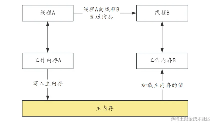 JMM 规定了所有变量存储在主内存,每个线程都有自己的工作内存,线程 A 和线程 B 如果需要通信的话,需要经过 2 个步骤: