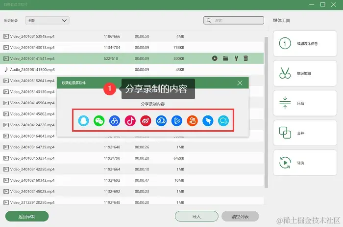 第4步:如果你想快速分享到其他社交平台,可以来到录制历史页面,右键选择想要分享的视频文件,点击分享按钮即可进行操作。