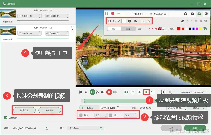 第3步:设定好录制区域后,点击 “开始录制” 按钮,即可录制屏幕。录制过程中,可以通过点击 “结束” 按钮来结束录制。