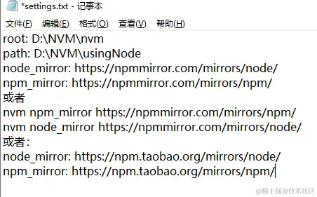 如果下载node过慢或者安装失败,请更换国内镜像源, 在 nvm 的安装路径下,找到 settings.txt,设置node_mirro与npm_mirror为国内镜像地址。