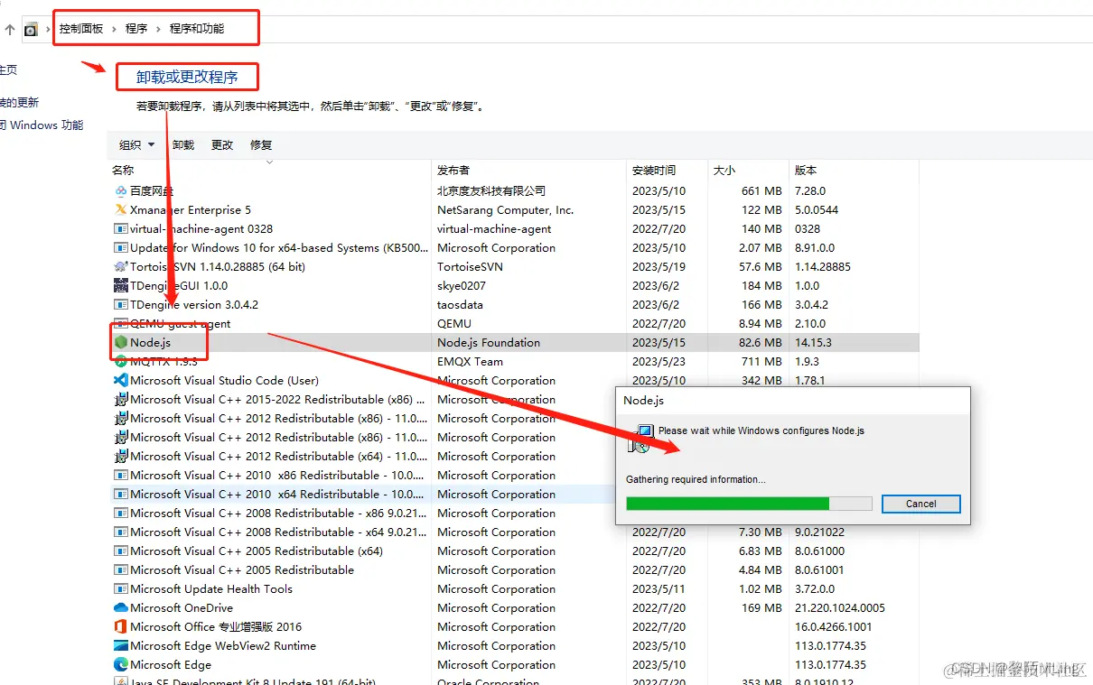 - 打开系统控制面板,找到node.js进行卸载
