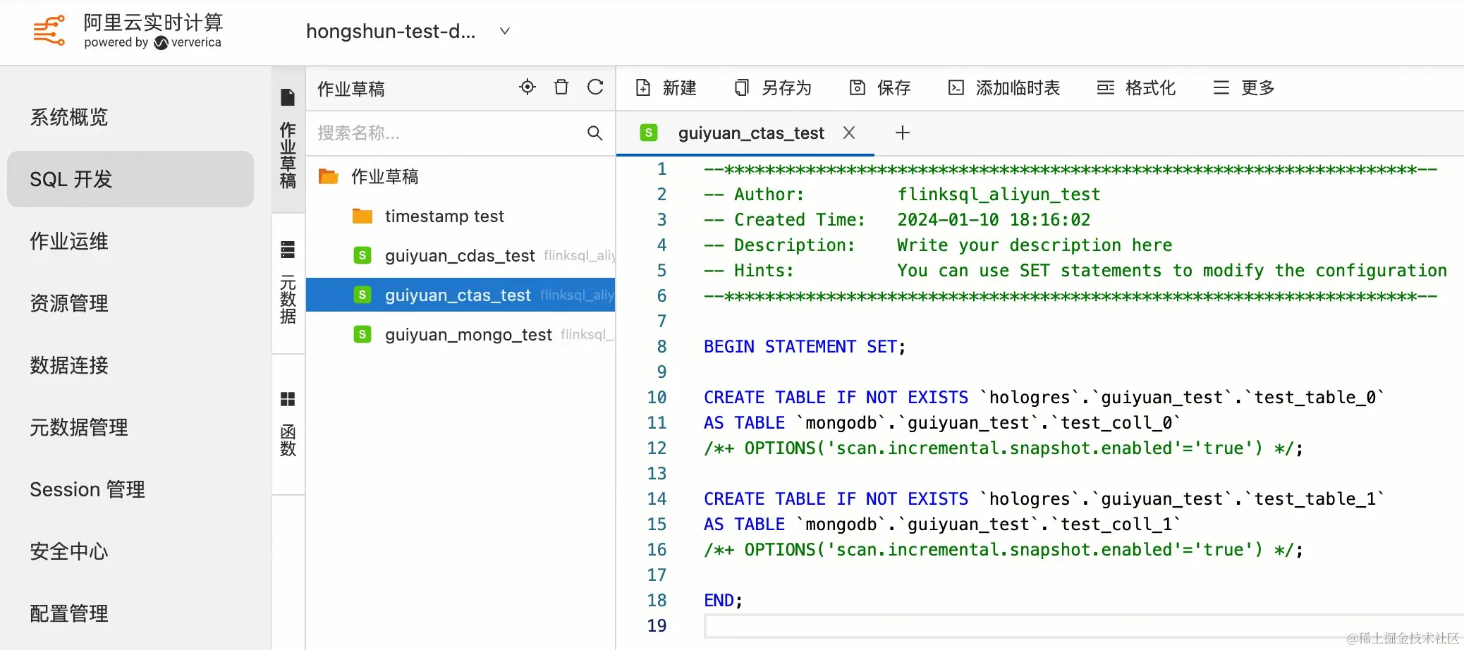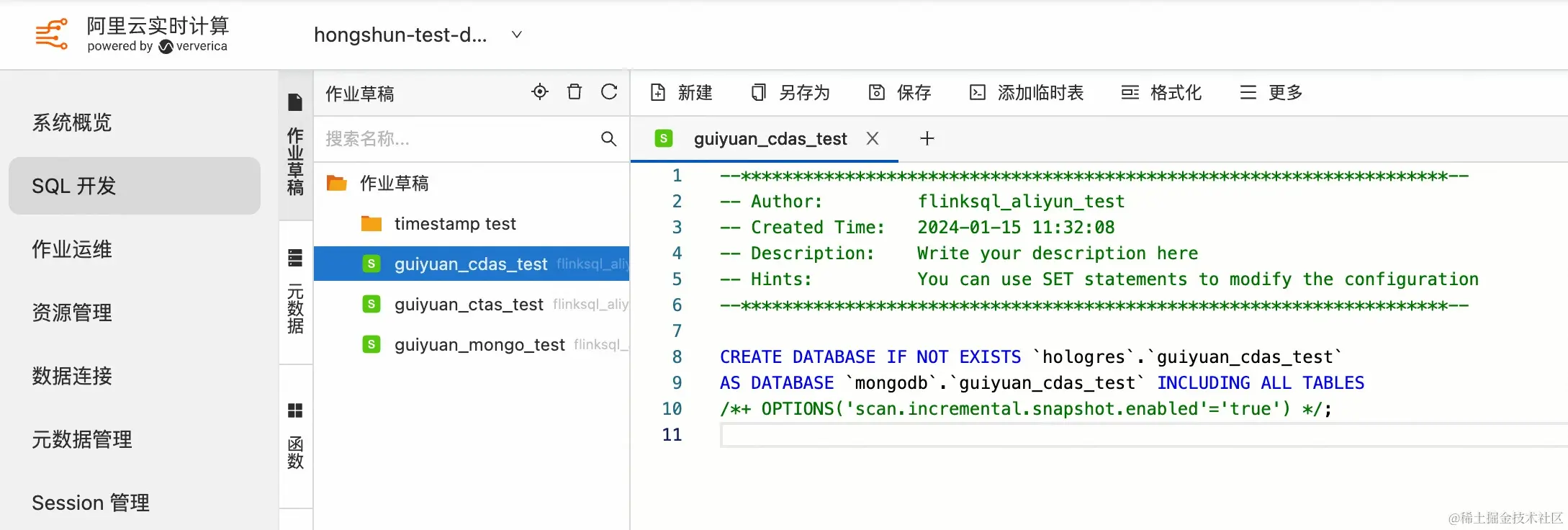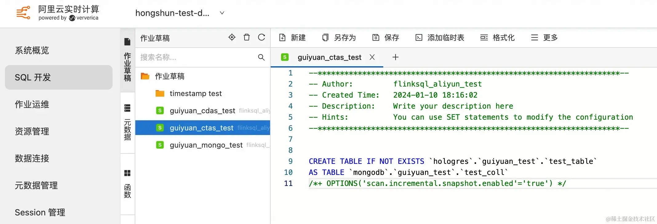 创建 MongoDB 和 Hologres 的 Catalog 后,在 SQL 开发页面编写 CDAS 作业,由于 MongoDB Catalog 会对 collection 做 Schema 推导,此处不需要手动定义表的 DDL: