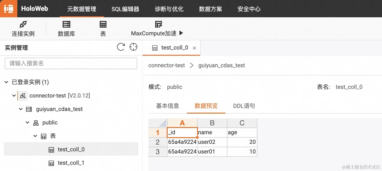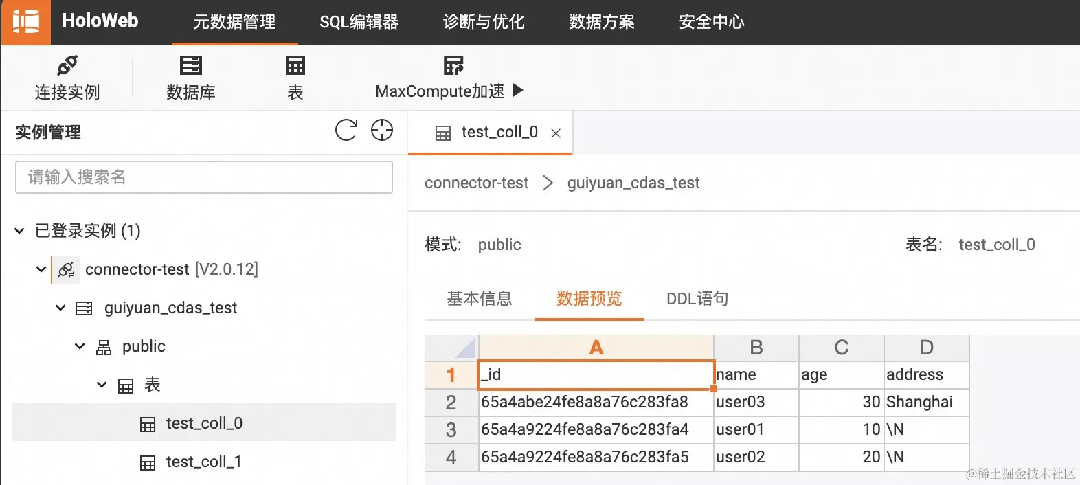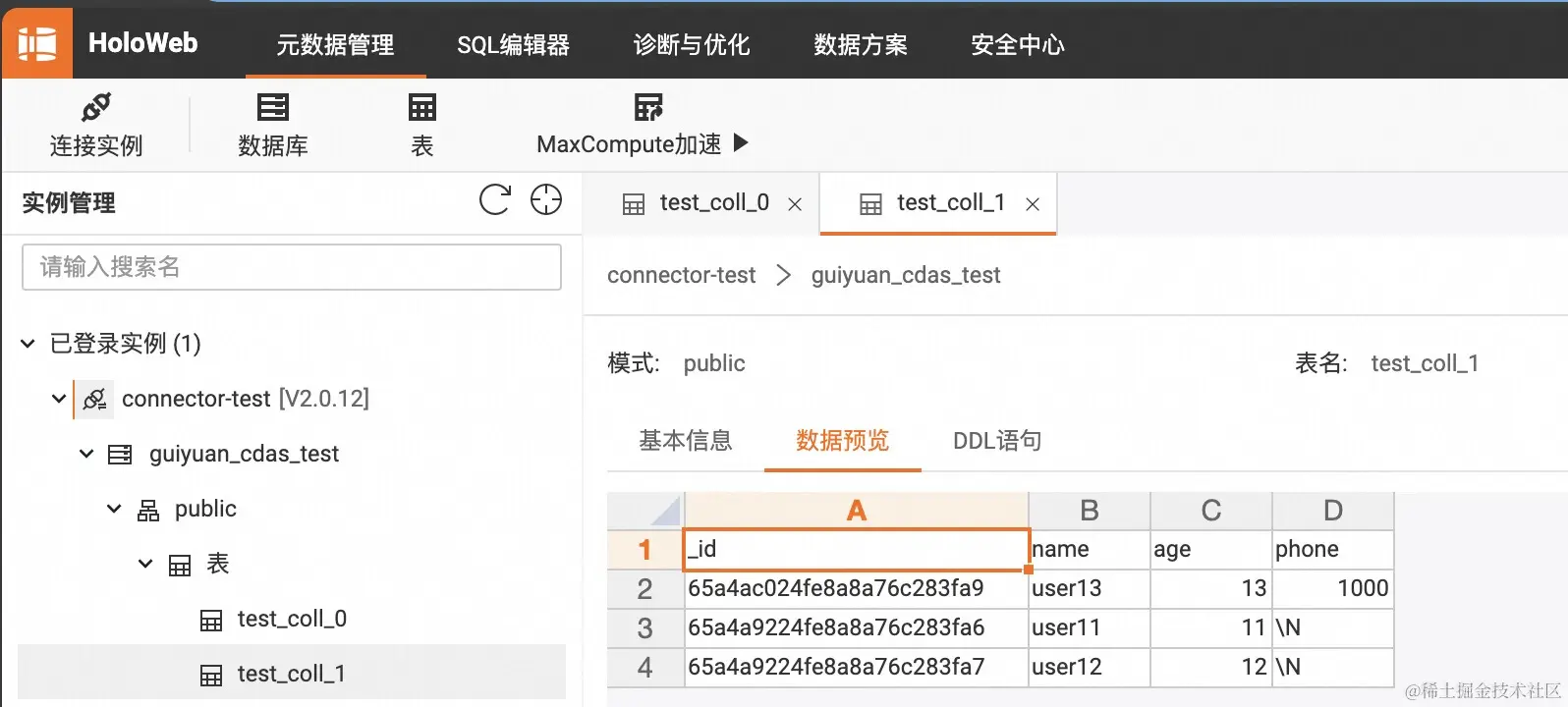 MongoDB 的数据库名称为 guiyuan_cdas_test,其中包含了两个 collection,名称分别为 test_coll_0 和 test_coll_1,我们希望将数据同步到 Hologres 的同名数据库 cdas_test 中。