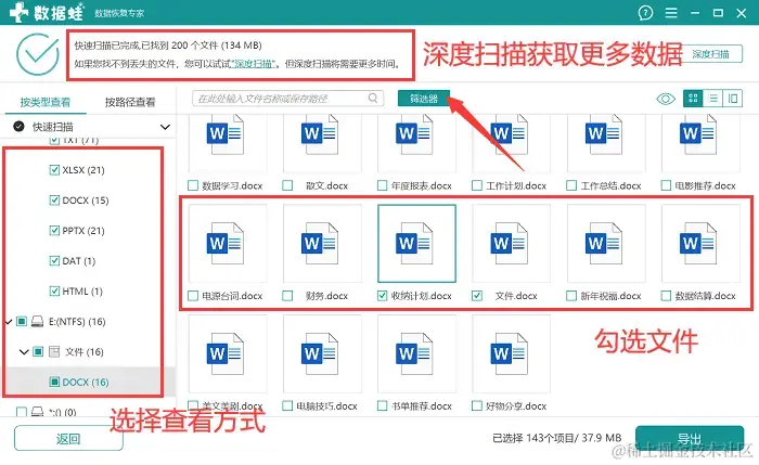 步骤4:在软件进行完深度扫描后,会呈现比较多文件,建议用户直接在【筛选器】中对相关文件进行定位,完成勾选后,点击 【导出】。