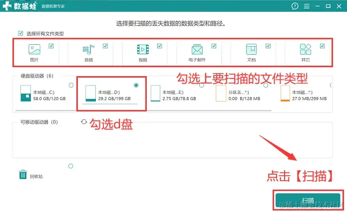 步骤2:将需要扫描和恢复的文件类型勾选上,并将【D盘】勾选上,点击【扫描】;