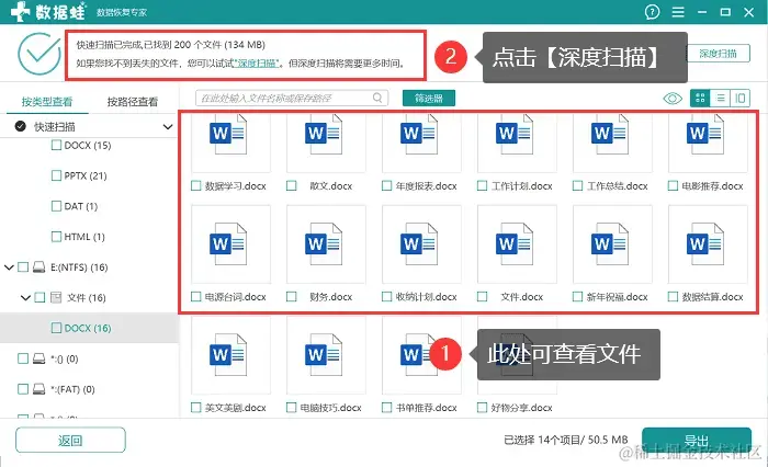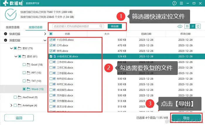 步骤4:深度扫描完成后,可以在 【筛选器】中对文件进行快速查看,找到需要恢复的文件后,单击将其勾选上,完成所有选择后,点击【导出】。
