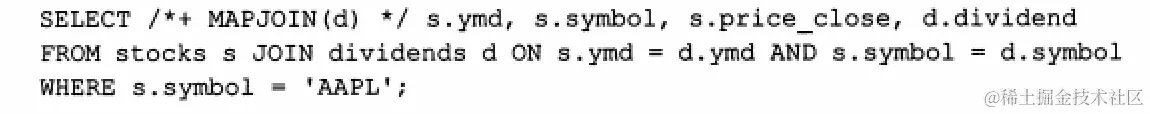 #-- Hive v0.7之前需要通过添加标记 /*+ MAPJOIN(X) */ 触发,如下图