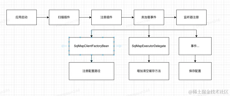 下面的@Plugin注解信息,然后注册插件信息,其中就包含springPlugin、ibatisPlugin等插件,插件的方法上会通过@OnResourceFileEvent注解方式,在资源变更后反射调用该方法。进而更新不同的文件信息缓存,同时会根据不同的类触发事件,写入不同的缓存信息,根据事件@OnClassLoadEvent(classNameRegexp = "com.ibatis.sqlmap.engine.builder.xml.SqlMapConfigParser") 写入sqlMapConfig配置信息,根据事件SqlMapClientFactoryBean注册配置文件内容,根据事件“SqlMapExecutorDelegate”添加清空缓存方法clearMapperState