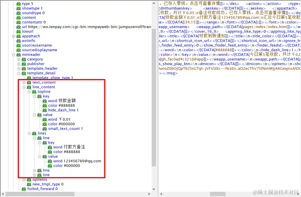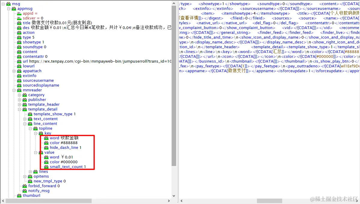 再来看看监听到的消息是什么,是一段xml,找个工具解析一下这段xml看看有什么可以用的数据