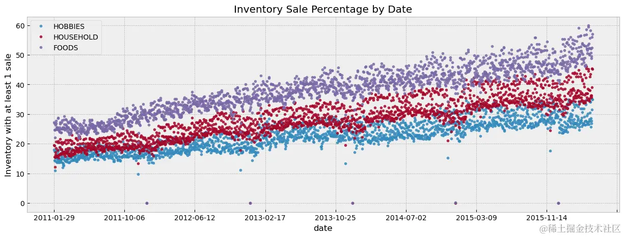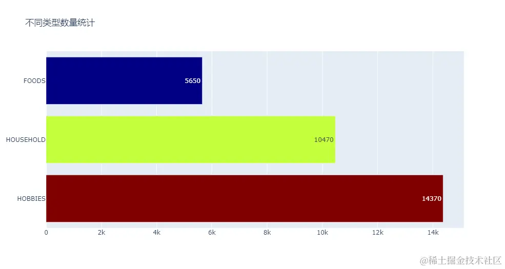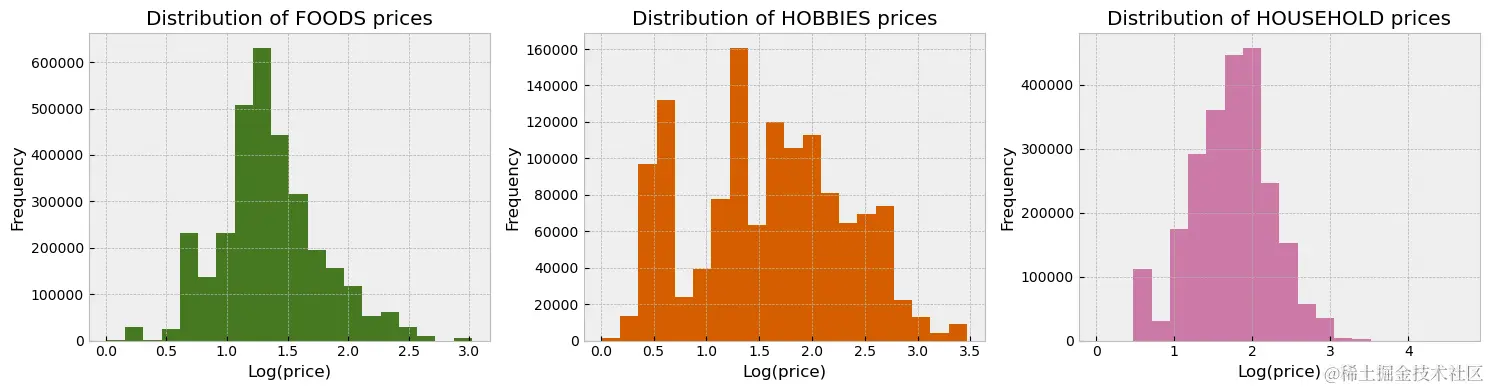 FOODS、HOBBIES、HOUSEHOLD三种不同类型的价格分布: