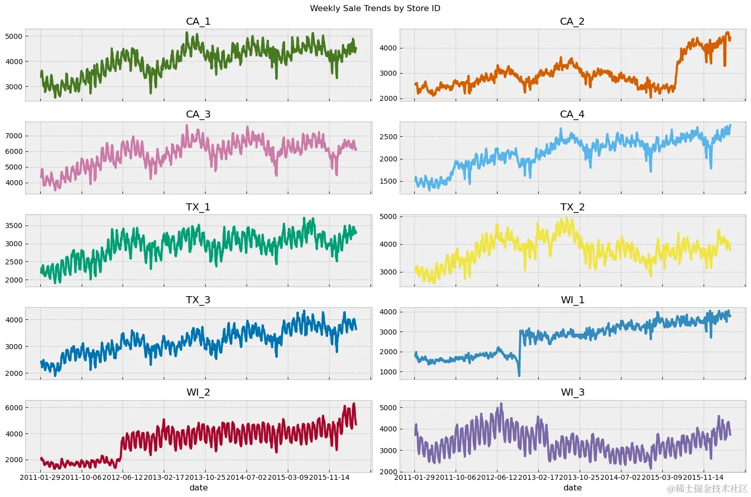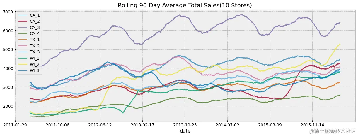 for store, d in sell.query("item_id == 'FOODS_3_090'").groupby("store_id"): # 筛选出指定数据,再根据store_id分组的数据进行绘图
