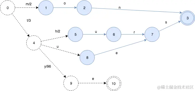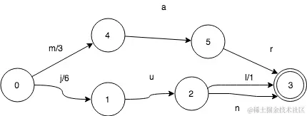 因此,输入key:“mar”,首先会跟随m来转移。 final状态是“jul”和“mar”共享的。这使得我们能用更少的空间来表示更多的信息。