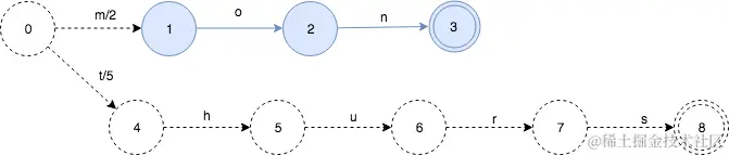 由于mon和thurs没有共同的前缀,只是简单的2个map中的key. 所以他们的output value可以直接放置在start状态的第1个转移上。