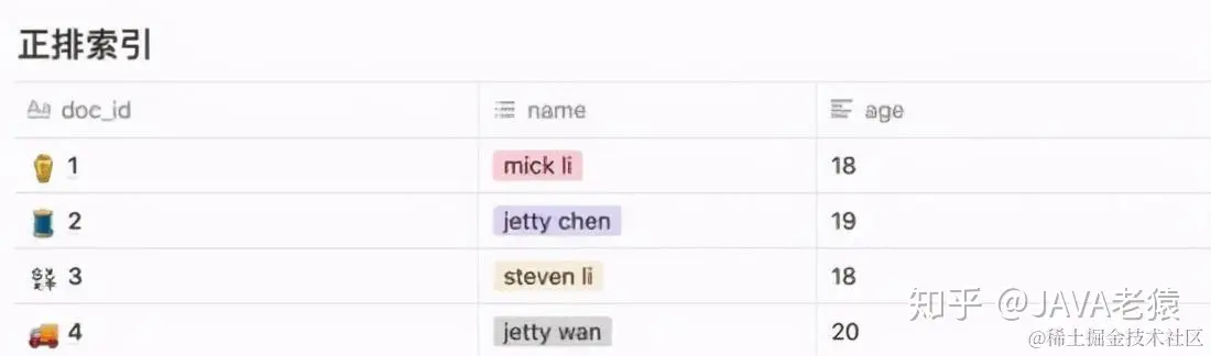 上图就是一个简单的正排索引。即将doc_id作为主键索引key,去查询到对应的一行数据value。