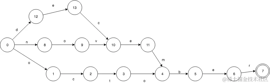 它们有共同的后缀“ber”,所以在FSA只出现了1次。 其中2个有共同的后缀“ember”,也只出现了1次。