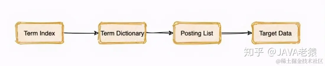 于是整个搜索过程就变成了先找到对应Term在Term Dictionary中的索引,而后再根据索引去查找Postion List,也就获取到了最终的数据。 即下面这个流程: