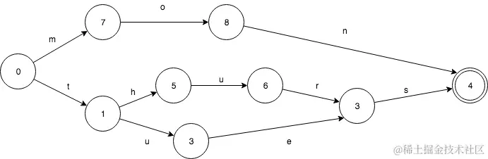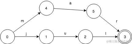 设想一下如果输入“jun”,在状态2的时候无法移动了,就知道不在这个集合里了。