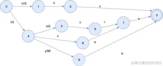插入tye,导致”es”部分被冻住,同时由于共享前缀t, 状态4->状态9的输出是99-3=96。