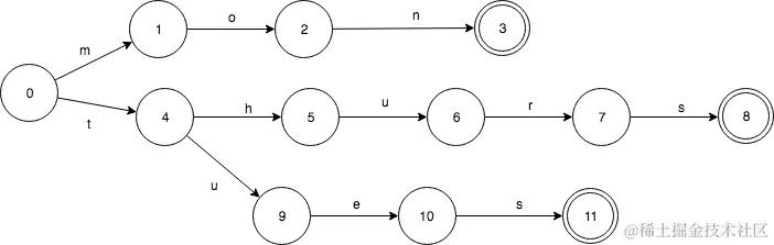 TRIE有重复的3个final状态3,8,11. 而8,11都是s转移,是可以合并的。