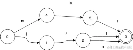 那么我们如何来遍历一个FSA表示的所有key呢,我们以前面的”jul”,“jun”,”mar”为例: