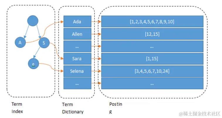 Mysql 只有 term dictionary 这一层,是以 b-tree 排序的方式存储在磁盘上的。检索一个 term 需要若干次的 random access 的磁盘操作。而 Lucene 在 term dictionary 的基础上添加了 term index 来加速检索,term index 以树的形式缓存在内存中。从 term index 查到对应的 term dictionary 的 block 位置之后,再去磁盘上找 term,大大减少了磁盘的 random access 次数。