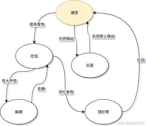 FSM(Finite State Machines)有限状态机: 表示有限个状态(State)集合以及这些状态之间转移和动作的数学模型。其中一个状态被标记为开始状态,0个或更多的状态被标记为final状态。 一个FSM同一时间只处于1个状态。FSM很通用,可以用来表示多种处理过程,下面的FSM描述了《小猫咪的一天》。